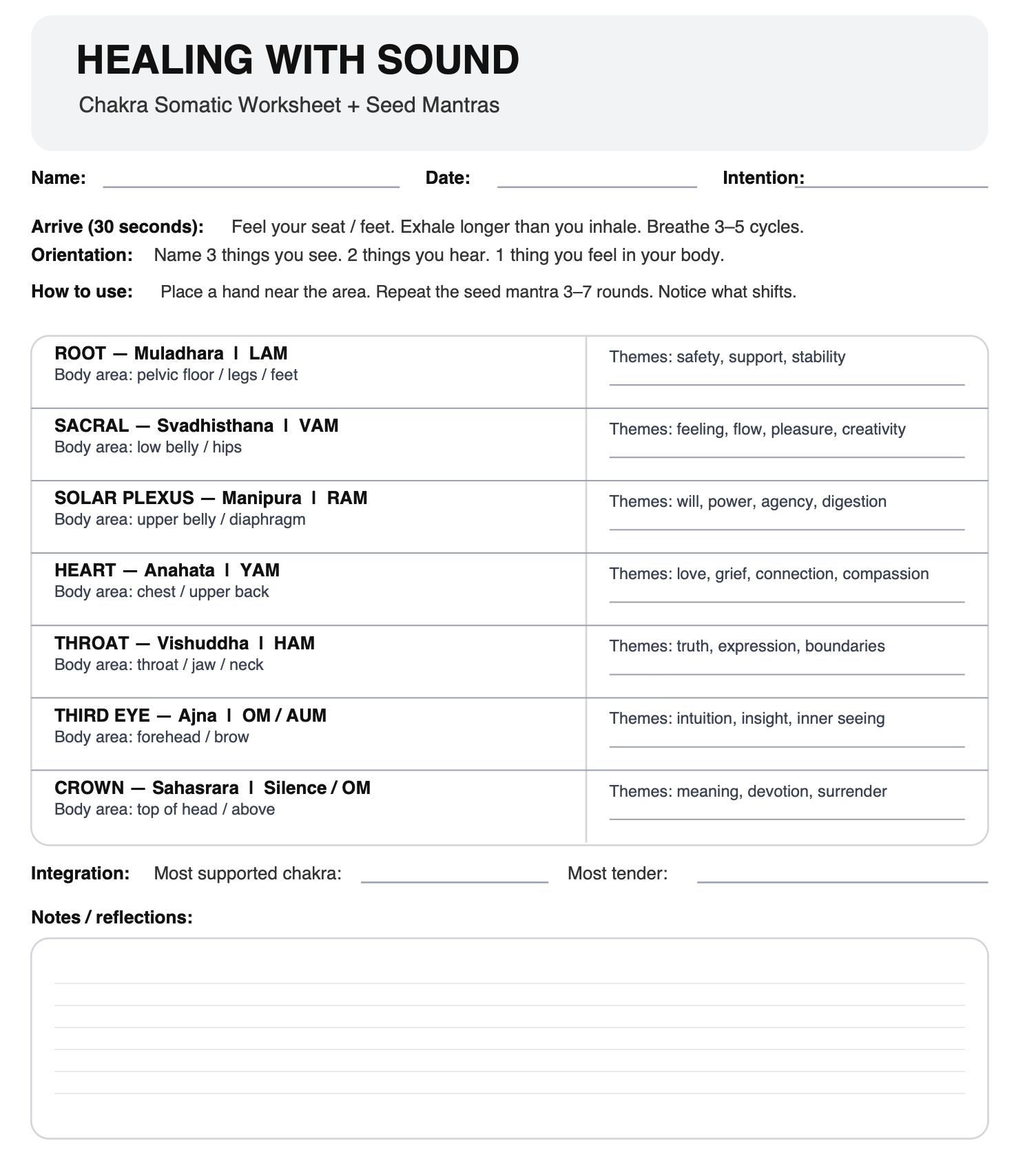 The chakra seed mantras are sacred sounds that help awaken, balance, and harmonize the body’s subtle energy centers. Through vibration, breath, and focused awareness, they can support grounding, clarity, emotional flow, vitality, and a deeper connection to the wisdom of the body and spirit.